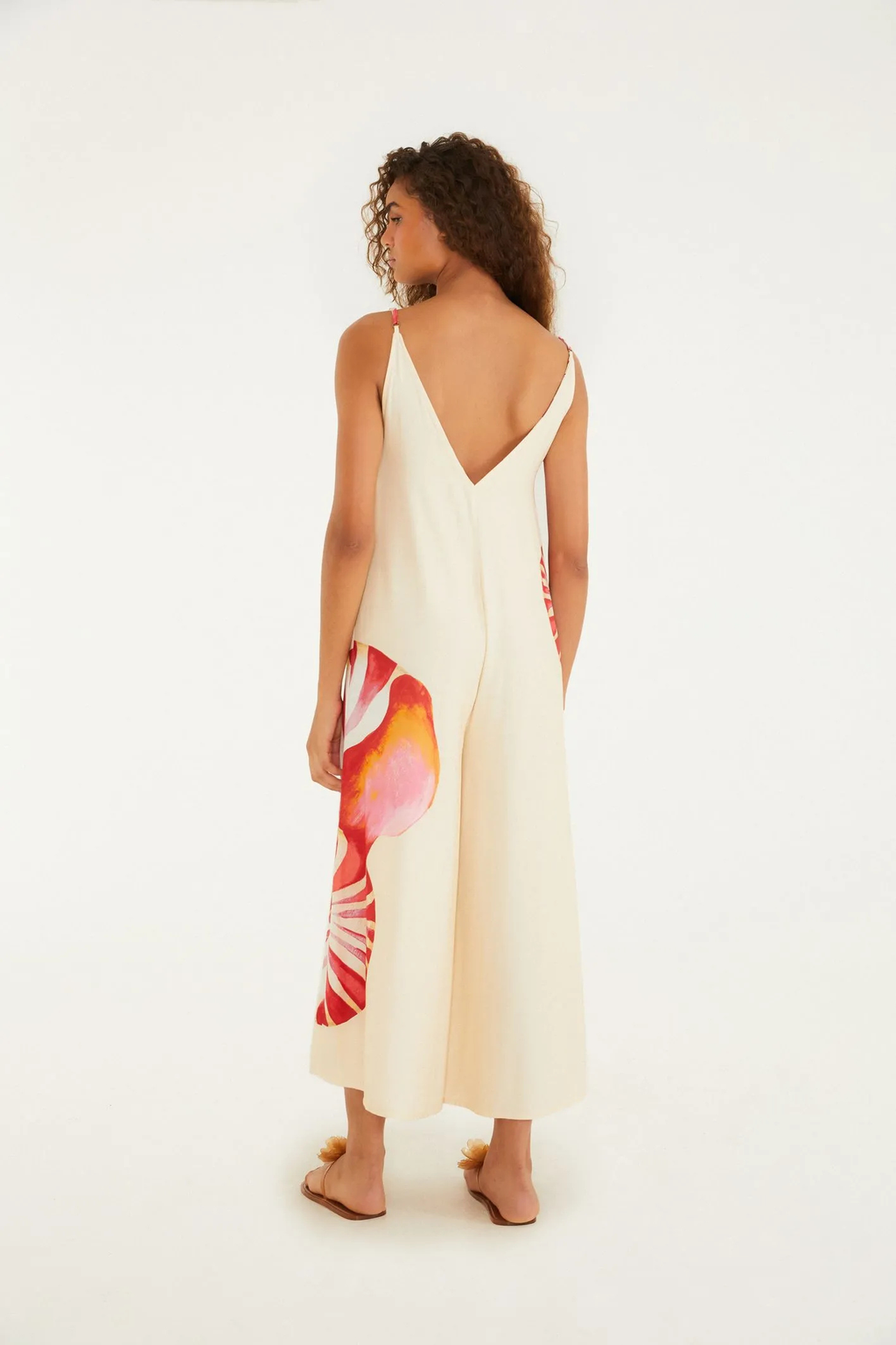 Macacão cropped estampado amonita. Com alças finas ajustáveis e decote em v, esta peça é perfeita para dias de lazer ou encontros especiais. O corte amplo garante conforto e estilo, enquanto os acabamentos cuidadosos proporcionam um toque de originalidade. Ideal para ocasiões casuais com elegância discreta.